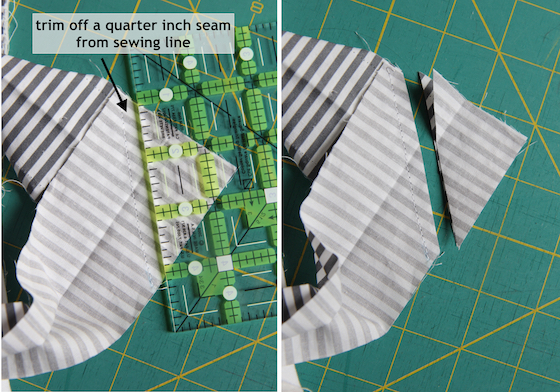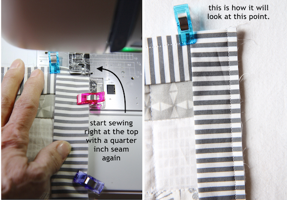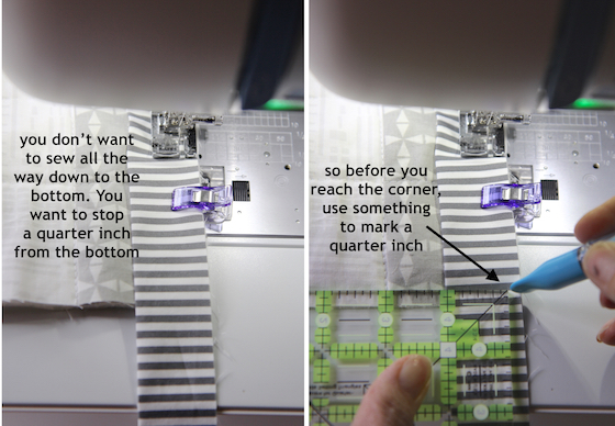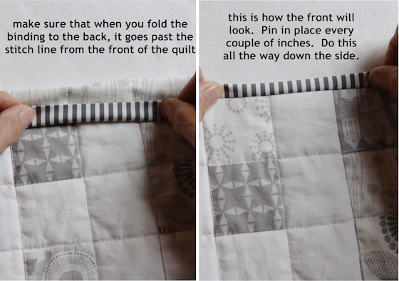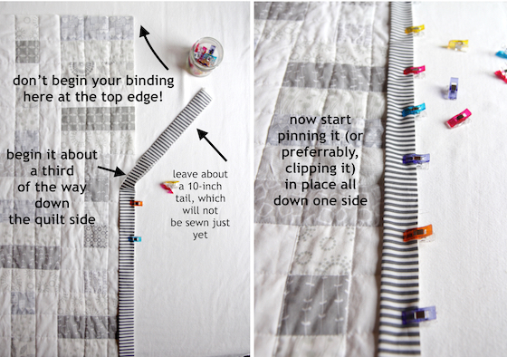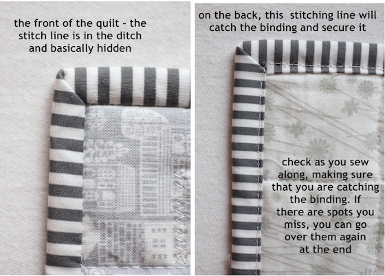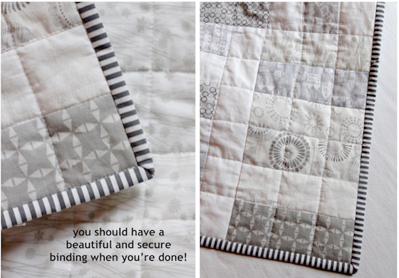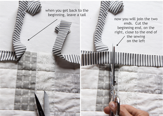 You will be cutting strips cross-grain to make this kind of binding and then sewing them together to make one long continuous strip. The tutorial shows you how to join the strips together on a diagonal, so the seams lay a little nicer.