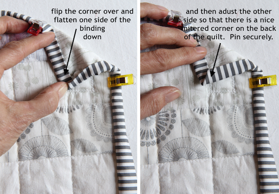 This binding is not difficult to do, but requires slow stitching for precision. I recommend using Wonder Clips from Clover instead of pins. They are faster, easier to use and more precise. They will hold your binding better than pins and will not shift as you clip and unclip them.