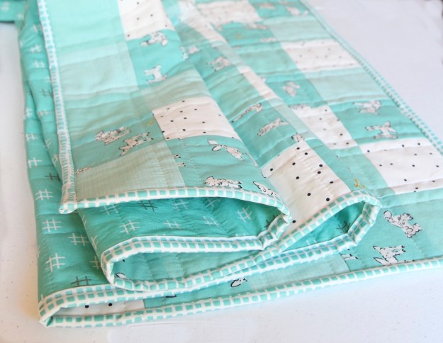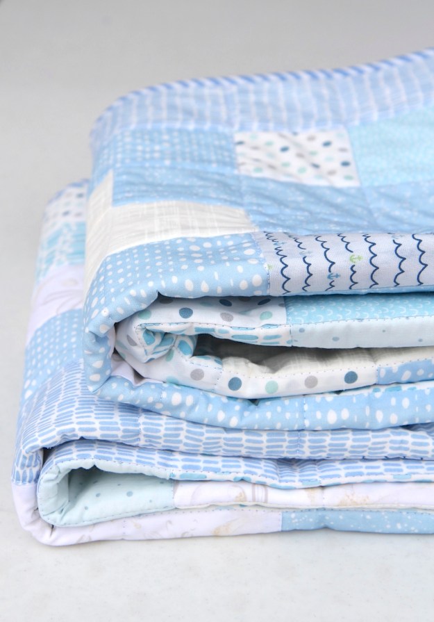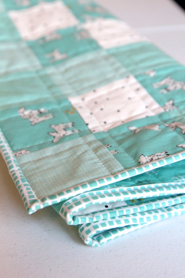 What’s a Cuddle Blankie? It’s a much smaller version of the quilt that a baby/toddler can clutch and cuddle with – which is what they love to do. This one is 16″ x 16″. And it’s so easy to whip one up to match the baby blanket.
