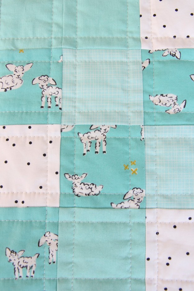 I actually doubled the batting on this quilt. I used Warm and White 100% cotton batting. The double thickness makes the quilt especially warm and snuggly. I love the weight of it. Because the background fabric I used for the checkerboard design is white, it is important to use a white batting so it doesn’t dull the white fabric.