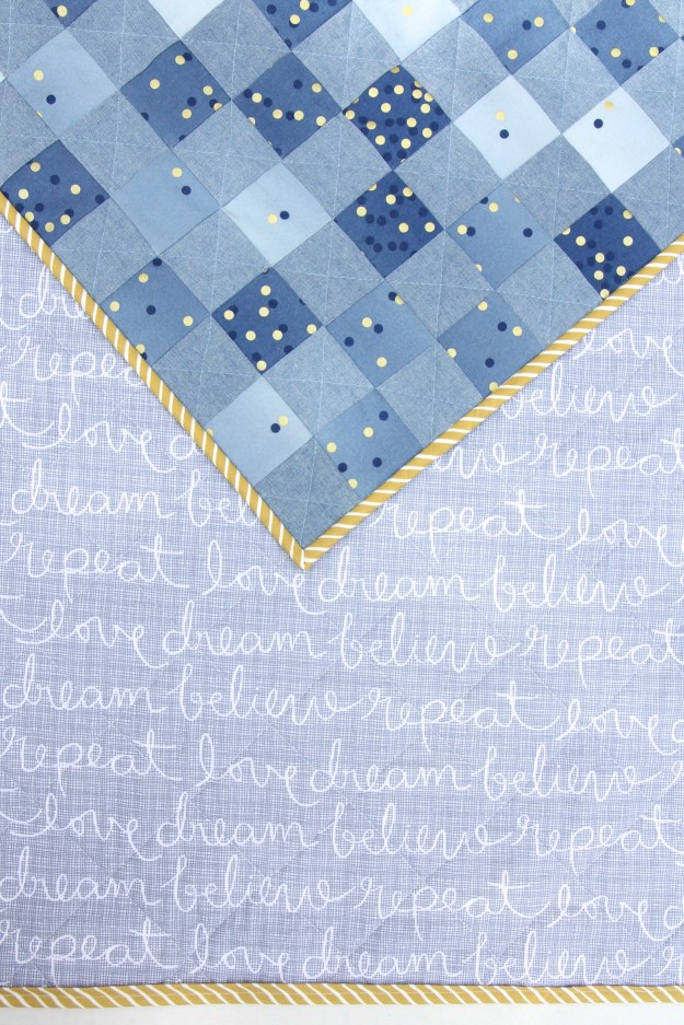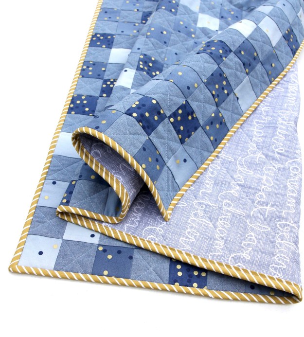 What’s a Cuddle Blankie? It’s a much smaller version of the quilt that a baby/toddler can clutch and cuddle with – which is what they love to do. This one is 16″ x 16″. And it’s so easy to whip one up to match the baby blanket.