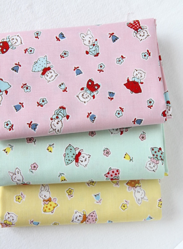 How adorable is this fabric from Penny Rose called Milk, Sugar and Flower Friends? I can’t wait to cut into these. This collection has several designs that are so darn cute. Here are a couple of more from that line and also a few fabrics that I thought would go well with these – a pink stripe from Dear Stella and pink flowers from Storybook Vacation, another awesome line of vintage 30’s fabrics that I need to stash.